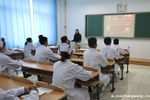 护理学院党支部书记刘飞飞围绕党的二十大的主题和主要成果、过去5年的工作和新时代10年的伟大变革、马克思主义中国化时代化等七个方面,全面解读了党的二十大报告的主要内容,号召全体学生党员在全面学习、全面把握、全面落实党的二十大精神上下功夫,准确领会党的二十大精神的实质与要义,自信自强、守正创新,奋力展现新时代青年学子的新作为。