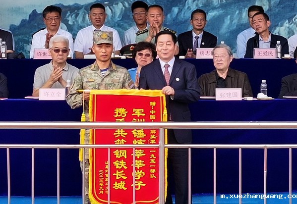 党委书记徐东升代表学校向承训部队赠送锦旗,房志伟中校接旗。