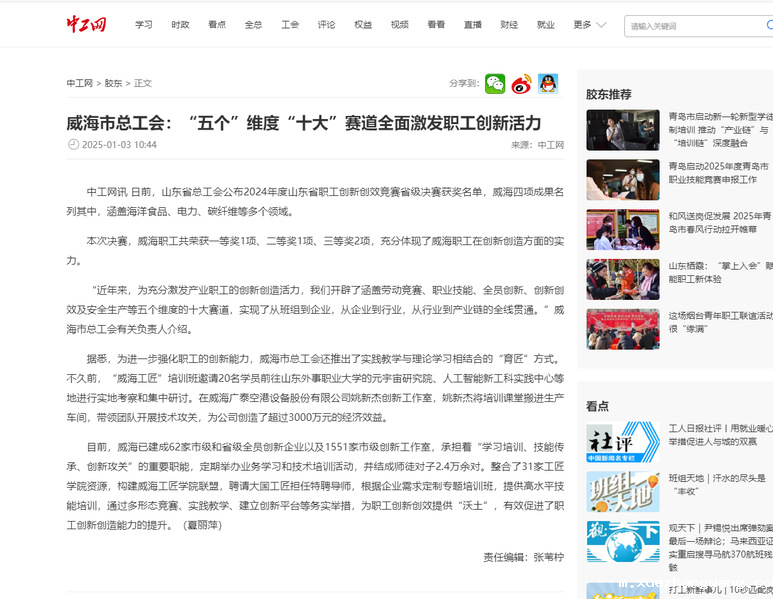 【中工网】威海市总工会:“五个”维度“十大”赛道全面激发职工创新活力