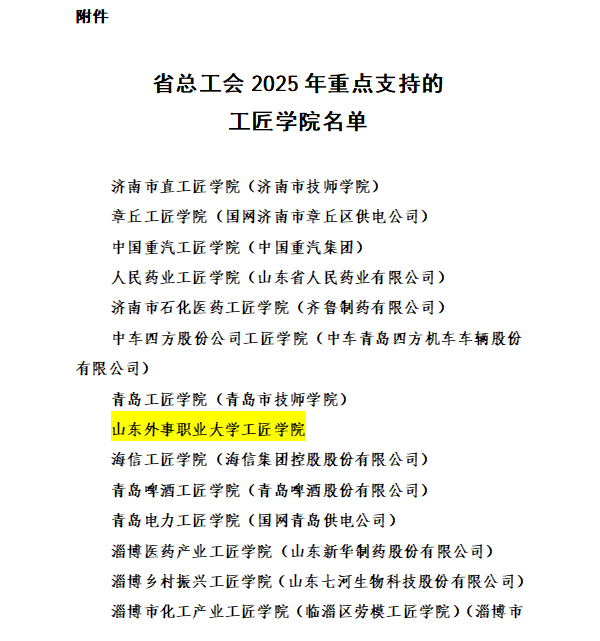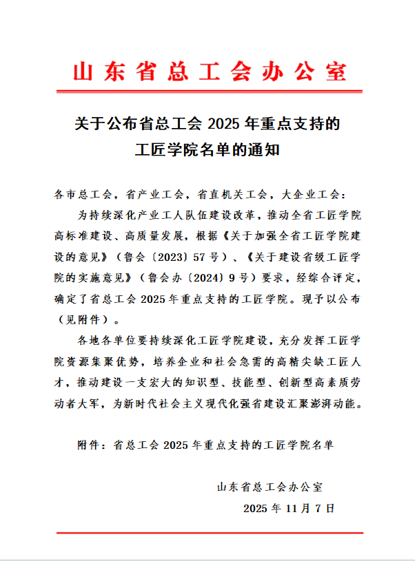 本站讯 近日,山东省总工会办公室印发《关于公布省总工会2025年重点支持的工匠学院名单的通知》。经过严格综合评定,j9·九游会游戏中国官方网站工匠学院成功入选省总工会2025年重点支持的工匠学院名单,并获得100万元配套建设资金。这标志着学校在工匠九游会国际集团和高技能人才队伍建设方面迈上了新的台阶,获得了省级层面的充分肯定与有力支持。