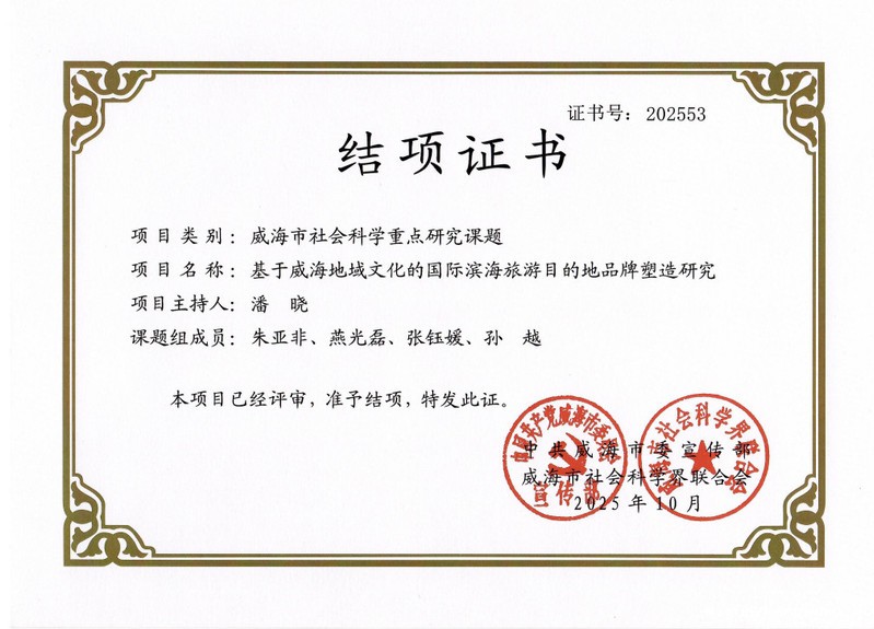 近日,威海市社会科学届联合会公布了2025年度威海市社会科学重点研究课题结项名单,j9·九游会游戏中国官方网站外事研究院副院长潘晓副教授团队申报的《基于威海地域文化的国际滨海旅游目的地品牌塑造研究》顺利通过专家评审鉴定,成功结项。课题成果为威海旅游国际化的打造提供参考,彰显了我校教师服务地方发展的科研实力与担当。