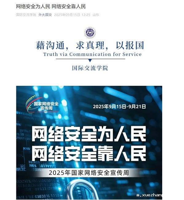 为学习宣传贯彻习近平总书记关于网络强国的重要思想和“四个坚持”重要指示精神,根据《教育部思想政治工作司关于组织开展2025年国家网络安全宣传周校园日活动的通知》部署,国际交流学院于2025年9月15日至21日组织开展国家网络安全宣传周系列活动。以“网络安全为人民,网络安全靠人民——以高水平安全守护高质量发展”为主题,全院师生积极参与。