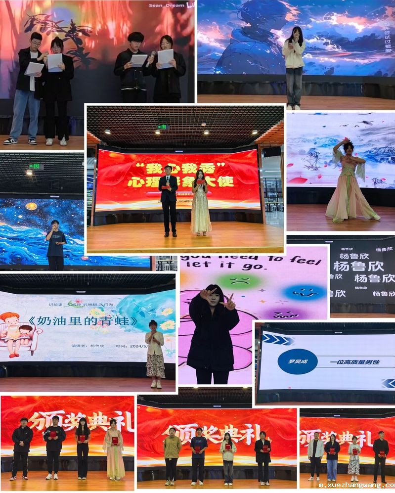 城市学院曹文轩声情并茂的诗歌朗诵;管理学院鲍奕霏婉转动人的歌声;信息工程学院颜廷恺积极向上的VCR;教育学院刘泽亚的古风舞蹈、杨鲁欣的双语故事;医护学院宛冰的手势舞;国际商学院郑明强的深情献唱;国际交流学院罗昊成的正能量;外国语学院高琳惠的脱口秀,精彩纷呈,高潮迭起,各学院的心理形象大使各显神通,为大家带来了才艺盛宴。